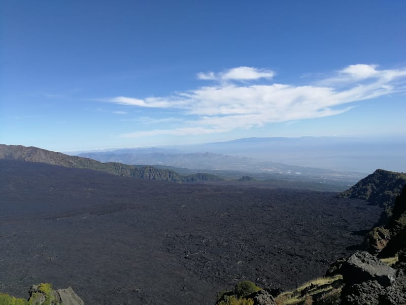 Across a valley of solidified lava, we shouted "Etna!" to hear the echoes of our voices. A moment later, Etna answered. It sounded like a distant thunder.